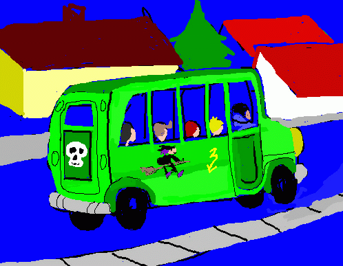 Und somit verwandelt sich der Busfahrer in einen großen braunen Klecks, aber nur für einen Augenblick. Peter und Paul fliehen hinaus und steigen in den verhexten Bus. Sie fahren ganz schnell. Weil der Peter nicht lang genug ist, muss der Paul unten mit der Hand Gas geben. Und der Peter muss lenken.